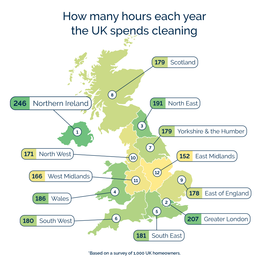 At the very bottom? The East Midlands, where people spend just 152 hours a year cleaning, nearly 100 hours less than those in Northern Ireland.