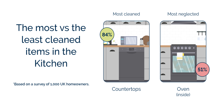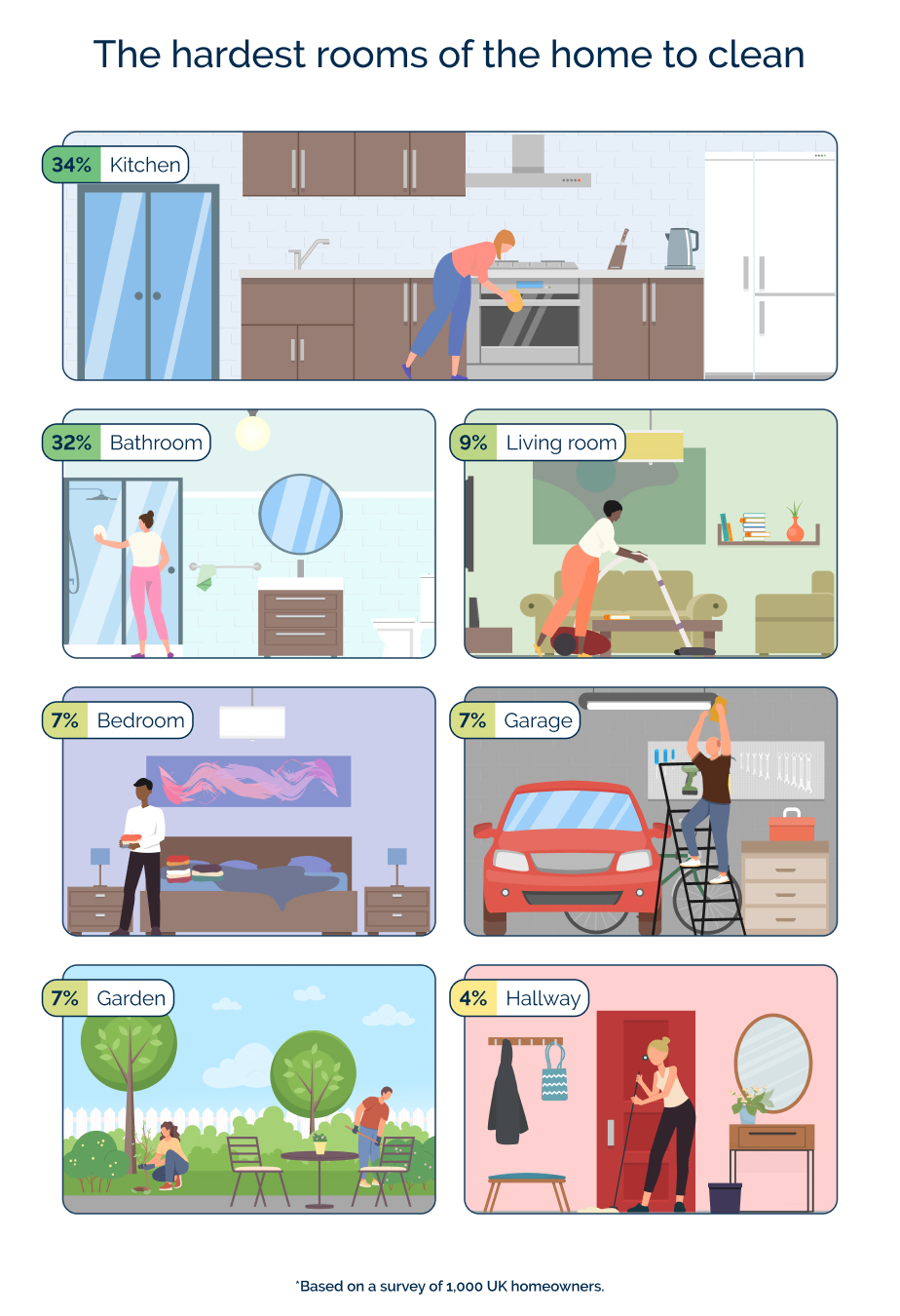 Surveying homeowners, we found two clear areas where Brits struggle most to keep things clean: the kitchen (34%) and the bathroom (32%).