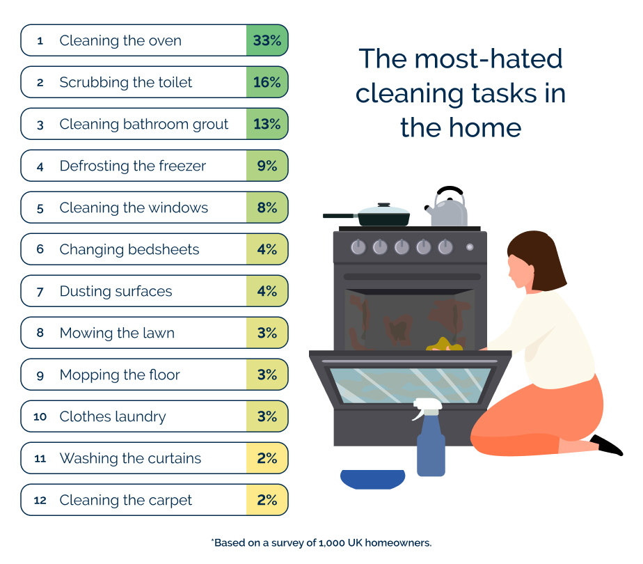 Cleaning the oven tops is the UK’s most loathed cleaning task in the home, with a third of respondents (33%) choosing this. This is followed by scrubbing the toilet (16%) and cleaning bathroom tile grout (13%).