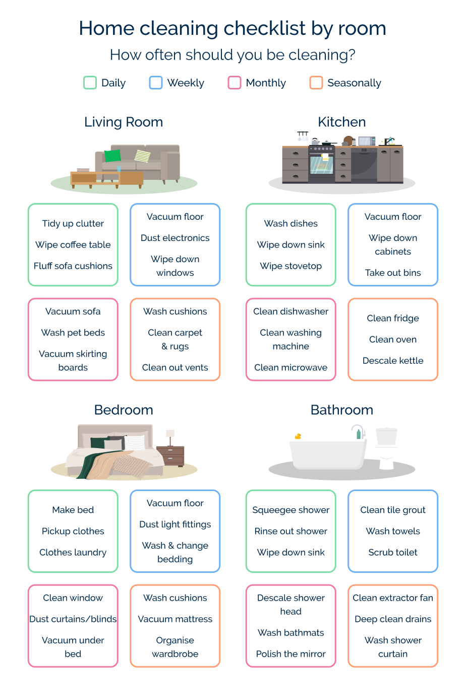 You can refer to this every week and month when it’s time to clean different aspects of the home. You might want to do this in a note on your phone, pen and paper, or a magnetic blackboard stuck to your fridge.