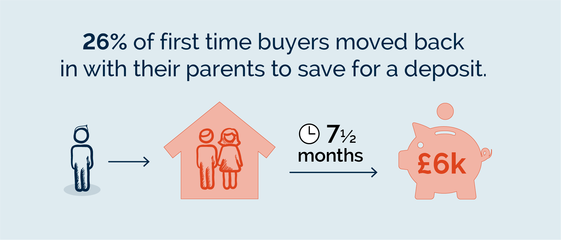 Over a quarter of first time buyers moved back home with their parents to help save for a deposit, rising to 43% in the 18-24 age bracket. Those who moved home were at their parents for an average of seven and a half months, whilst a third (33%) moved back for more than a year.