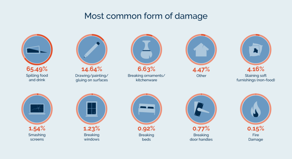 With regards to the most common form of damage, spilt food and drink on carpets and soft furnishings came out ontop (65.49%), followed by drawing and painting on walls (14.64%) and broken ornaments in third (6.63%).