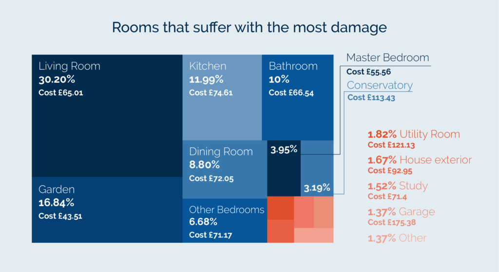 Our survey results highlight that accidents such as spills, stains and other damages to soft furnishings proved to be the most common form of damage. Though they were damaged less frequently, spaces like the utility room and the garage proved much more expensive to fix, with some costs coming in at as much as £175.