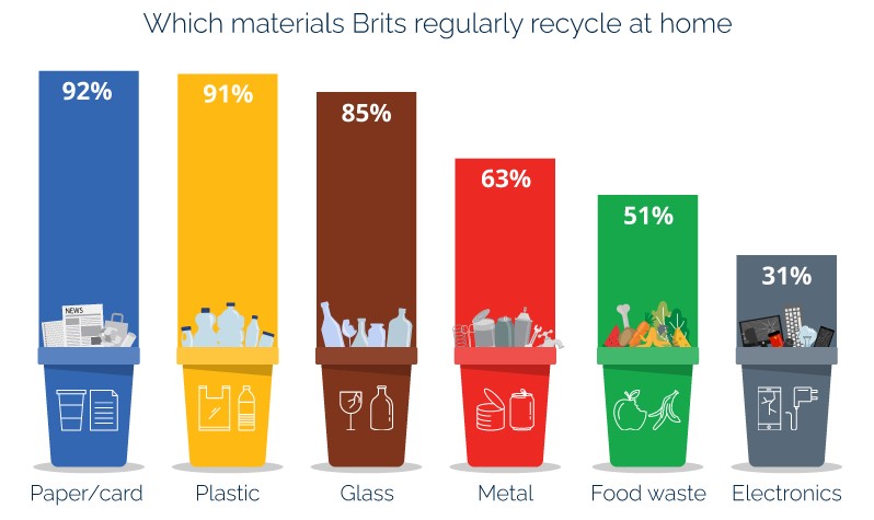 Starting with which items Brits are recycling the most, 92% said they recycle paper and card, followed by 91% of people recycling plastic. A further 85% of UK households also stated they recycle glass; however, this number drops down to 63% for metals such as tins.