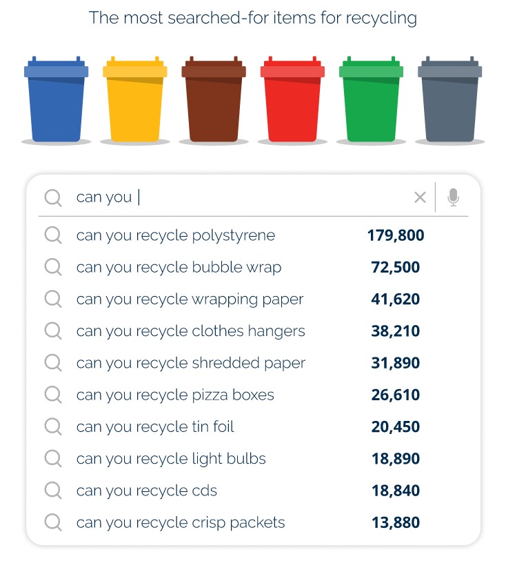 Topping the list is polystyrene, with a total of 179,000 searches. This is most commonly used for take-away food containers and to package white goods. This material cannot usually be recycled and should be placed in the waste bin.