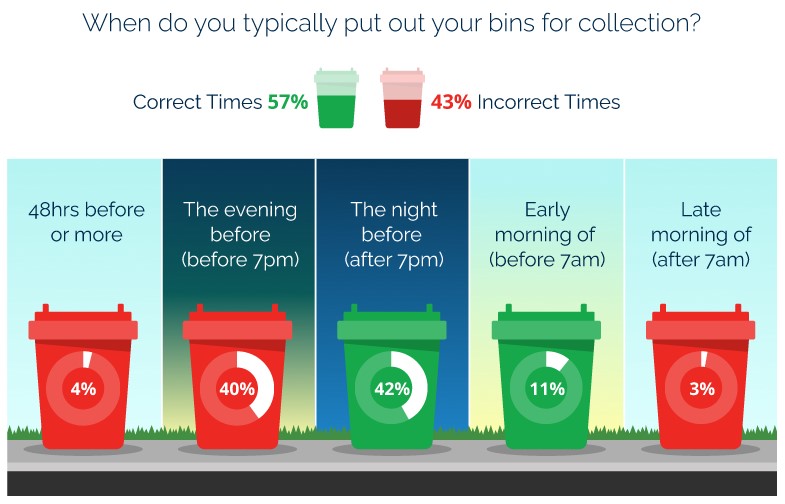 Despite this, almost half (47%) of homeowners are putting out their bins outside of this time frame, with 40% placing them out in the early evening before the 7 pm guideline.