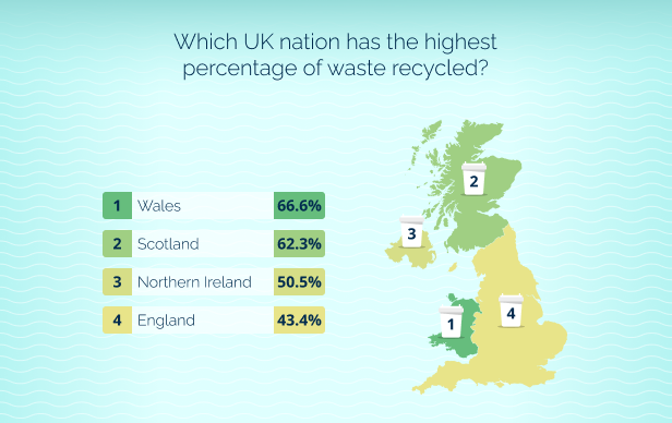 - Wales is the best at recycling, with an average total of 66.6% of waste actively being reused or recycled.