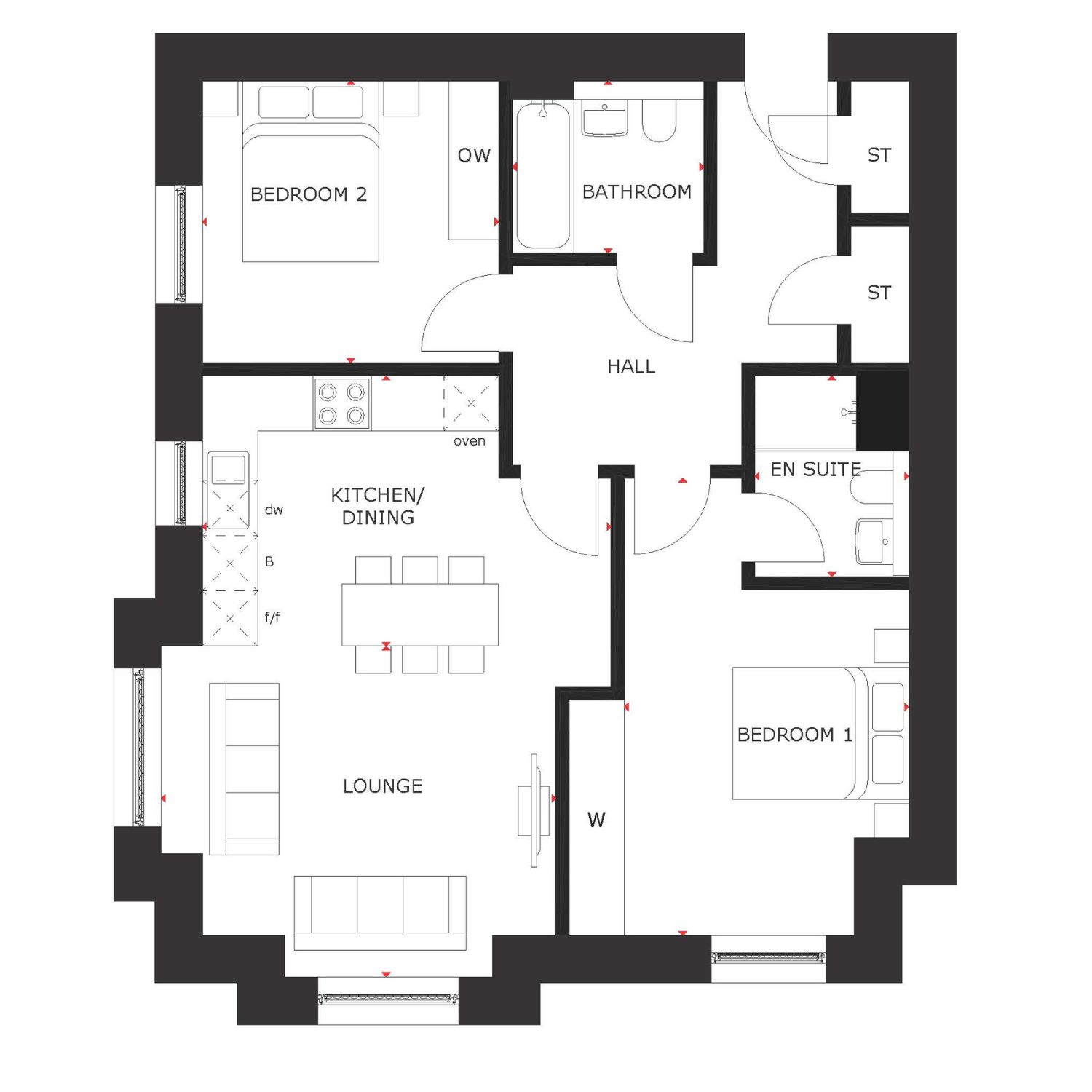 The Strathtyrum apartment offers contemporary living in a sleek open-plan layout. A stylish kitchen flows into the bright lounge and dining space, perfect for relaxing or entertaining. With two spacious bedrooms - the main featuring an en suite, a modern bathroom and plentiful storage, this apartment blends practicality, comfort and modernity perfectly.