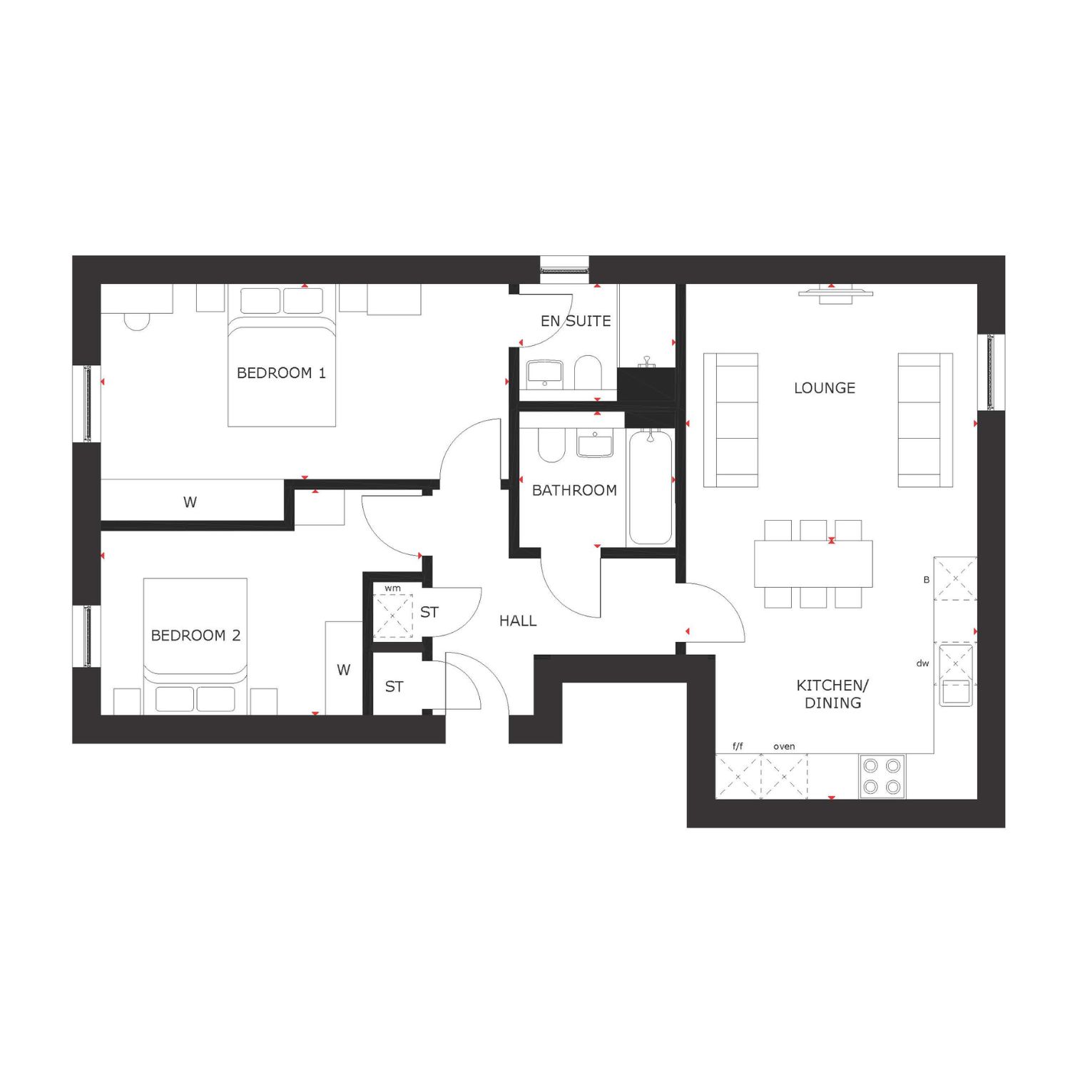 The Balgove is a two bedroom apartment, perfect for those looking for their first home or downsizing. There is an open-plan kitchen/dining/lounge area, as well as two double bedrooms - with the main bedroom featuring an en suite. A full bathroom and storage cupboards complete this home.