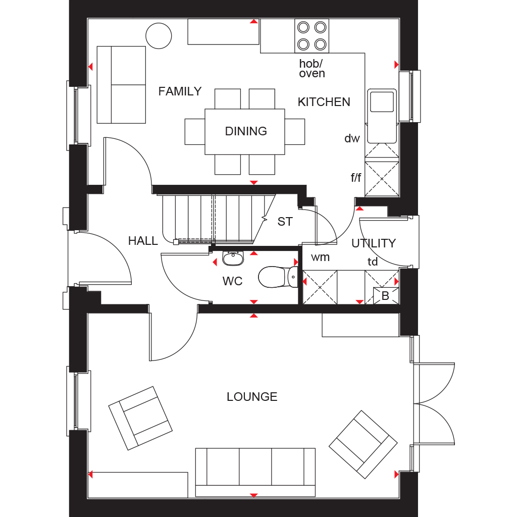 This detached home has an open plan kitchen with dining area and a separate utility. There's also a lounge with French doors to the garden, some understairs storage and a cloakroom.