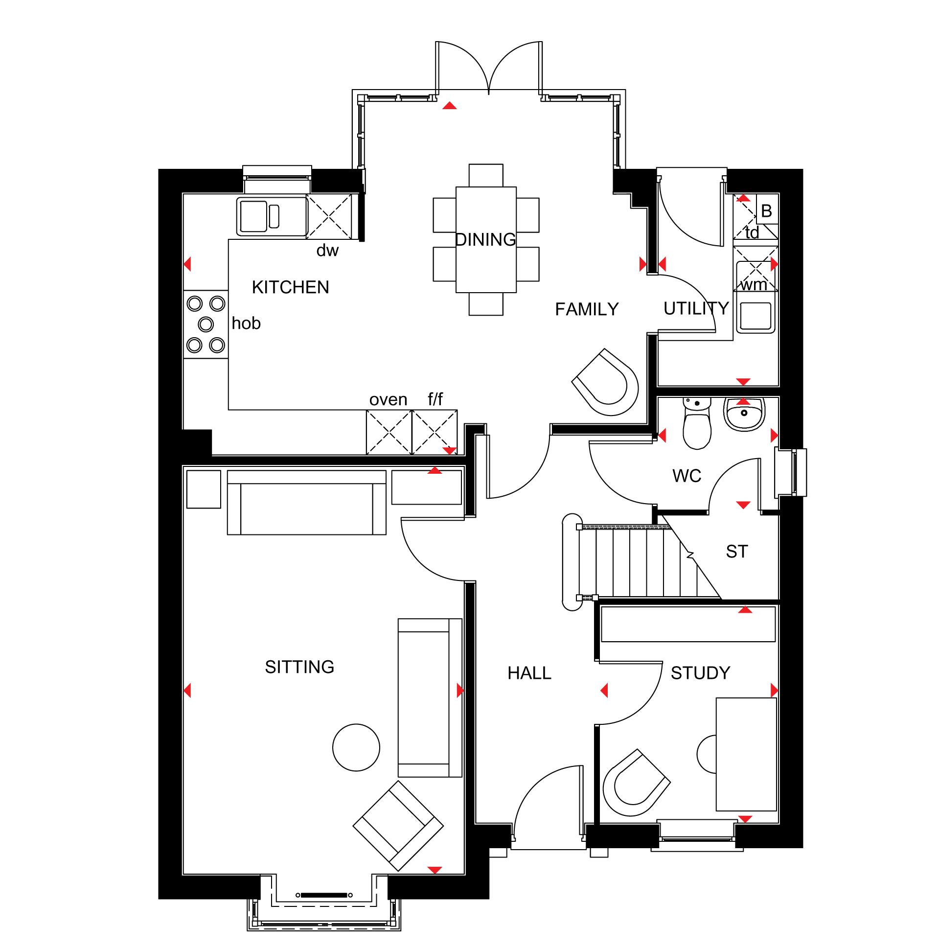 This detached home has a spacious open plan kitchen with French doors to your garden. The bay fronted lounge and a study completes the ground floor.
