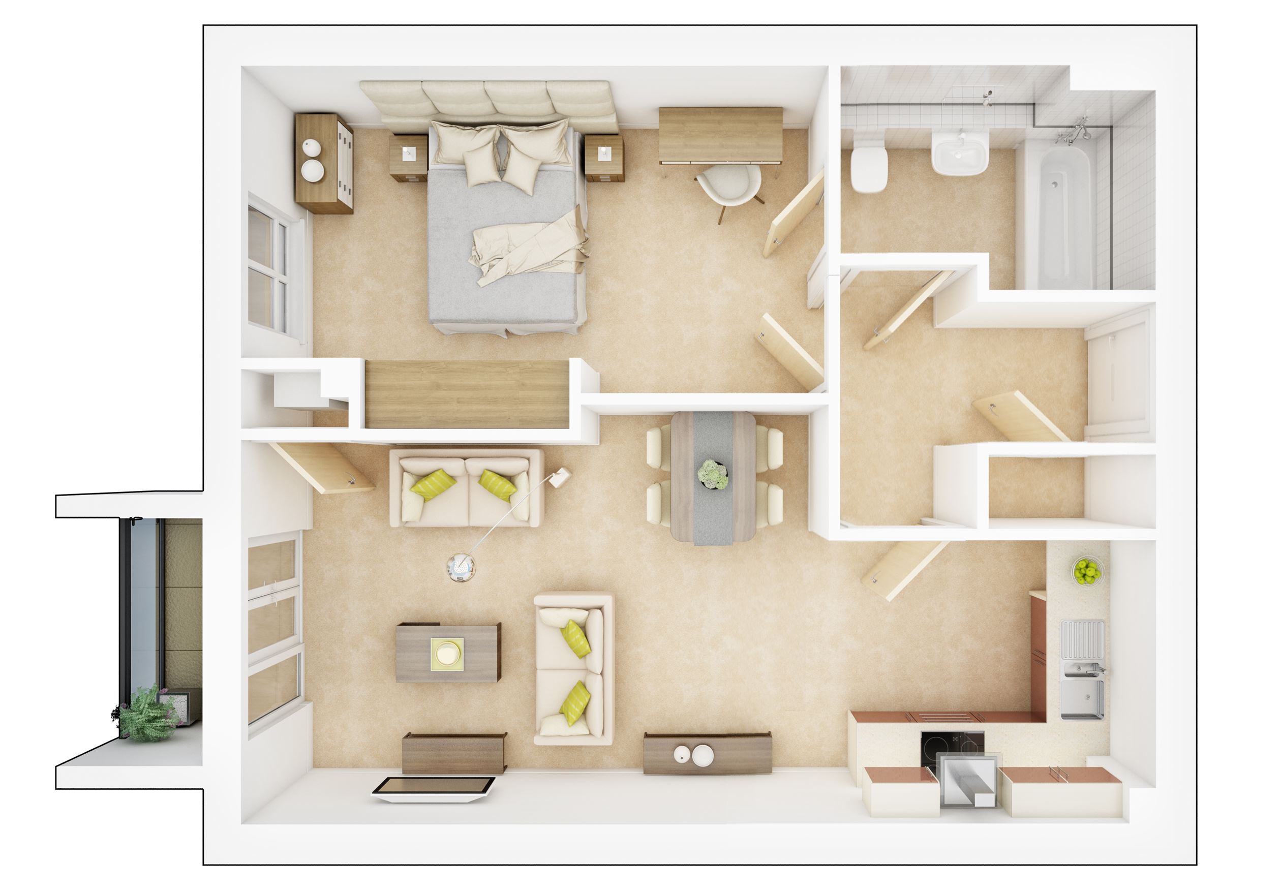 This stylish apartment offers an open-plan kitchen/dining/lounge area with French doors leading onto your private terrace. Good sized-bedroom with a contemporary en suite and plenty of wardrobe space.