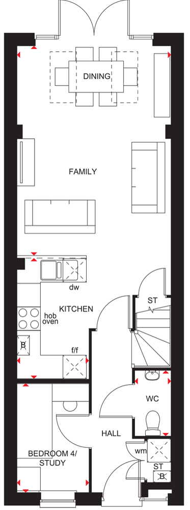 The Thorney: This detached home features an airy open-plan kitchen with dining and family areas, and French doors to the rear garden. A study completes the ground floor. The first floor includes a spacious lounge/bedroom 4 and the main bedroom with en suite. The second floor has a bathroom and two double bedrooms.