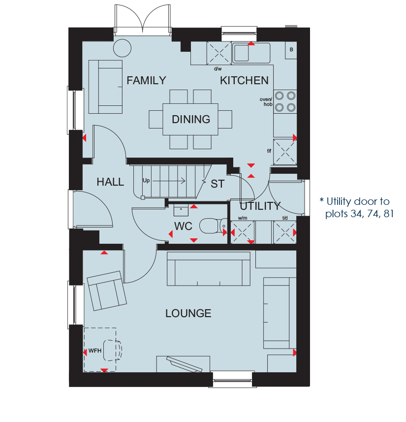 This detached home has an open plan kitchen with French doors to the garden and a separate utility. A comfortable lounge, some understairs storage and a cloakroom completes the ground floor.