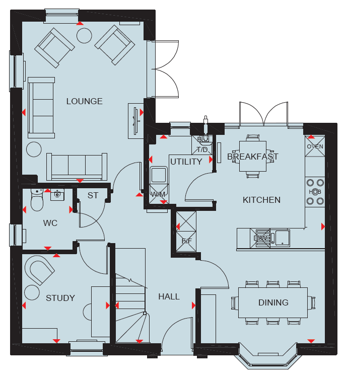 Downstairs you'll find a open plan kitchen/diner with a bay window with adjoining utility room with extra storage space. The triple aspect lounge has French doors leading to the garden and the private study is perfect for working from home.